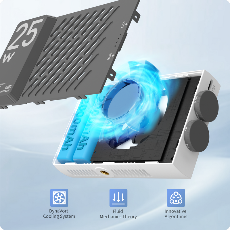 CINEPEER CM25, 30 dakikaya kadar sabit, tam güç çıkışı sağlayan (4300k renk sıcaklığına göre) iki adet dahili 2000mAh pil ile donatılmıştır. PD adaptörlerini ve PD uyumlu güç bankalarını destekler ve uzun çekim seansları sırasında gönül rahatlığı sağlar